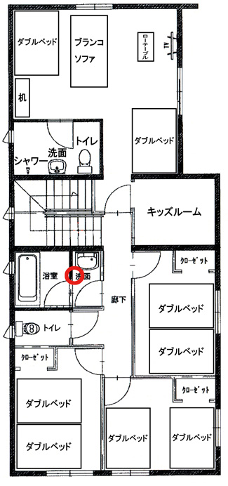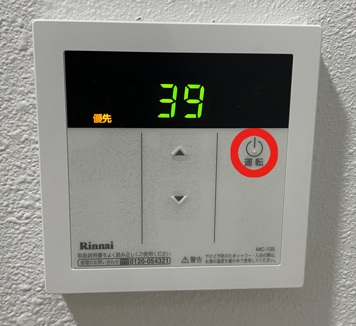 給湯器のスイッチは赤丸の部分、2階の洗面所のところにあります。