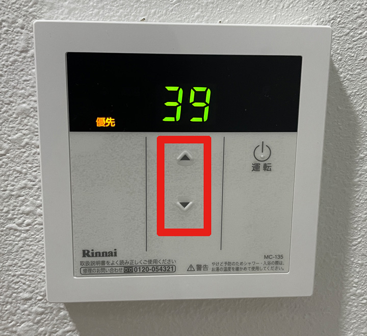 温度の調整は、赤四角の部分を押すことで調整が可能です。